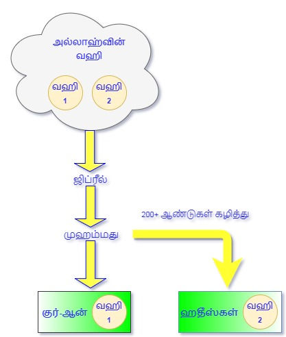 மேற்கண்ட படத்தை கூர்ந்து கவனித்தால், அல்லாஹ்வின் இரண்டாவது வஹியானது, 200+ ஆண்டுகள் மனிதர்களின் கைகளினால் கறைப்பட்டுவிட்டது. இதற்கு ஆதாரம் உள்ளதா? என்ற கேள்வி எழும் போது, நாம் புகாரி முஸ்லிம் போன்ற ஹதீஸ்களை கவனிக்கவேண்டும்.